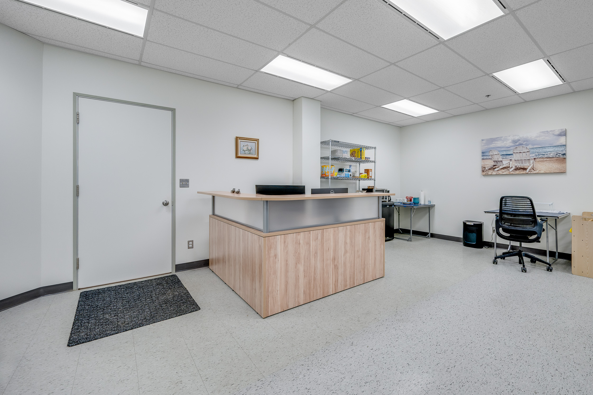 Elevator accessible, bright office space featuring an open-concept layout and dedicatedreception/waiting area and a small kitchenette